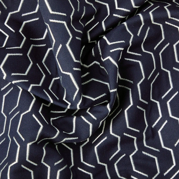 Sunbrella® Adaptation Indigo is a solution-dyed, woven upholstery fabric from the Sunbrella Makers Collection. This fabric features a metallic abstract geometric design set on a deep, navy blue background. Adaptation is woven from a blend of acrylic, polyester and PVC. The addition of PVC and polyester to Sunbrella’s acrylic yards gives this fabric added durability and abrasion resistance.